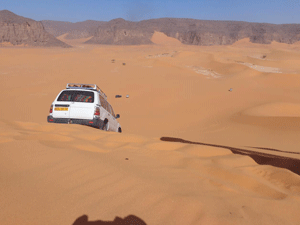 Several million years ago, this land had been covered with lava and now unique formations stand out on the sand. Though we were in 4wheel drive vehicles, camels are still an important mode of transportation in the Sahara.